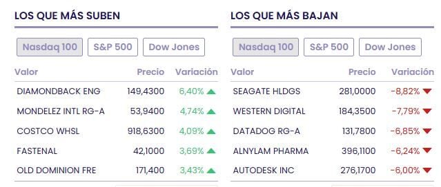 Por el lado de las acciones perdedoras tenemos a Seagate Hldgs (-7.72% a 284.47 dólares), Western Digital (-6.10% a 187.68 dólares) y Amgen (-3.37% a 330.11 dólares).