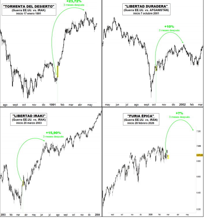 Más allá del gráfico, el informe introduce un elemento que desafía la lógica inmediata del mercado: la experiencia histórica en contextos de conflicto. “Desde 1991, los tres conflictos de Estados Unidos con países de Oriente Medio han sido alcistas a tres meses (y más allá) para el S&P 500”, subraya Renta 4. Un patrón que rompe con la reacción inicial de aversión al riesgo y sugiere que el mercado termina mirando más lejos que el ruido geopolítico.