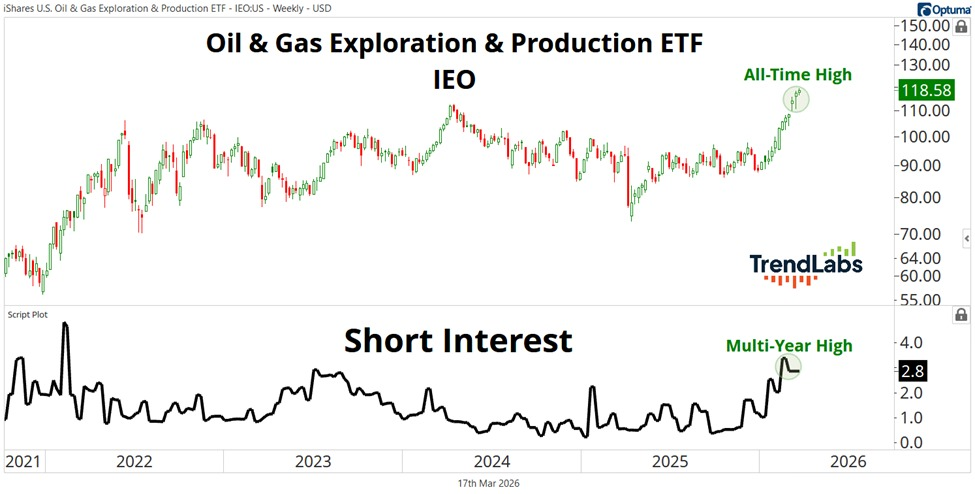 La posición corta en el ETF de exploración y producción de petróleo y gas de EEUU, $IEO, ha subido hasta el 2,8%, cerca del máximo de los últimos cuatro años. La posición corta se ha triplicado desde principios de 2026.