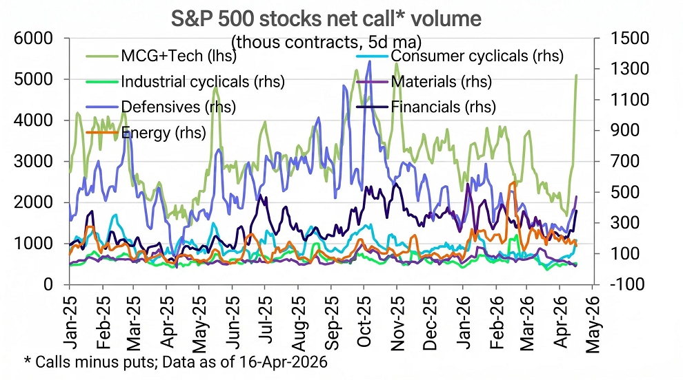 Hablando de las grandes tecnológicas, según Deutsche Bank, la compra de opciones de compra en el sector tecnológico está experimentando un fuerte repunte en estos momentos.