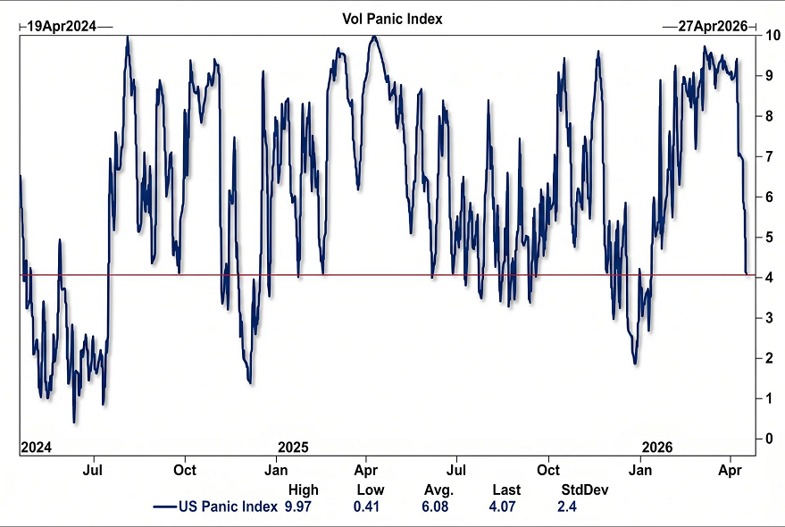Y todo esto, con el miedo del mercado descendiendo, lo que favorecería las compras. El índice de pánico de Goldman ha caído en picado, lo que podría significar que las preocupaciones sobre la guerra con Irán han pasado a un segundo plano.