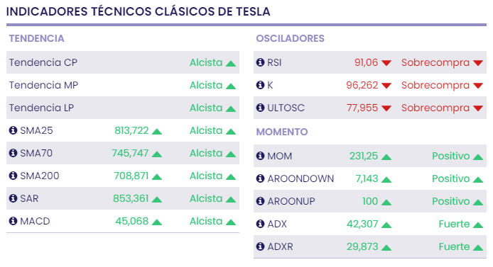 Las acciones de Tesla cerraron el pasado viernes en rojo en los 1.222,09 euros y los osciladores de los indicadores de Ei solo se muestran en rojo.