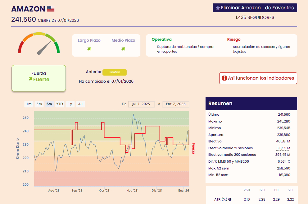 Por último, Amazon sí se encuentra fuerte en bolsa, según los indicadores premium de fuerza y tendencia. De hecho acaba de pasar de neutral a fuerte según nuestros indicadores.