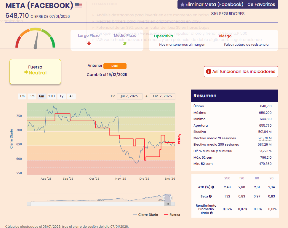 Según los indicadores premium de fuerza y tendencia, Meta se encuentra neutral, por lo que para confirmar esas buenas sensaciones de los brokers, deberíamos esperar a que el valor se vuelva fuerte o muy fuerte.