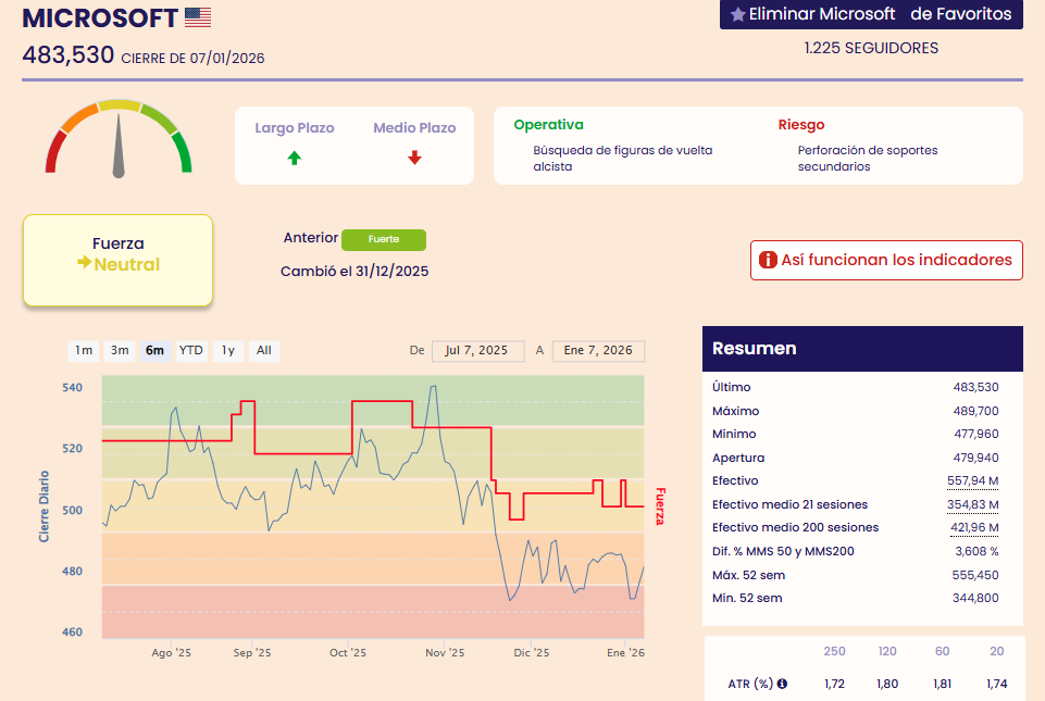 Ocurre lo mismo que Meta, Microsoft se encuentra neutral según los indicadores premium de fuerza y tendencia, por lo que no deberíamos entrar en el valor hasta que pase a fuerte o muy fuerte.