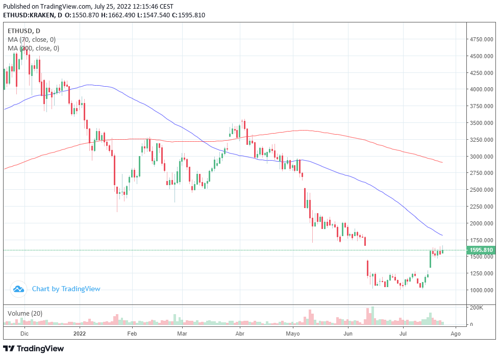 Ethereum cotiza en los 1.500 dólares al mediodía y la media móvil de 70 periodos se encuentra por encima de las últimas velas.