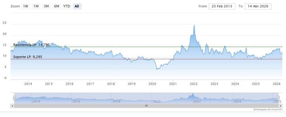 La resistencia a mediano y largo plazo se encuentra en los 14.79 dólares. Mientras, los indicadores de Ei se muestran mixtos.