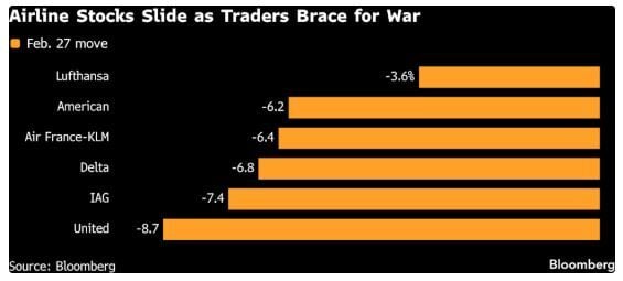 En Europa, IAG se desplomó hasta un 13%, la mayor caída desde noviembre de 2021, mientras que la hotelera francesa Accor llegó a caer un 11%. La australiana Qantas Airways Ltd. cayó un 5.4%, Japan Airlines Co. un 5.9% en Tokio y Singapore Airlines Ltd. un 5.3%.