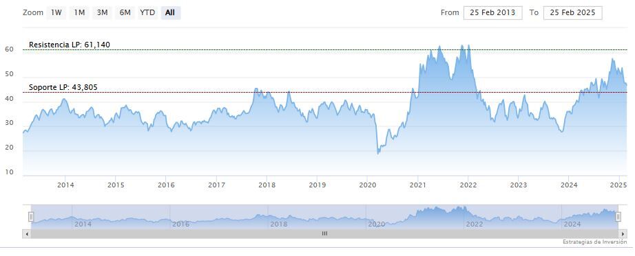 La resistencia a mediano plazo se encuentra en los 58.25 dólares. Mientras, los indicadores de Ei se muestran mixtos.