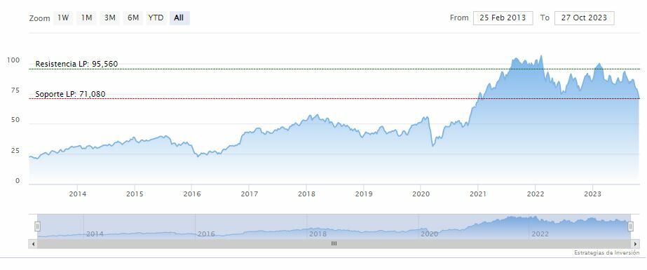 Morgan Stanley cerraba la semana pasada a la baja en los 70.40 dólares. Las medias móviles de 70 y 200 periodos se mantienen por encima del precio, RSI debajo del nivel de sobre venta y las líneas del MACD se mantienen debajo del nivel de cero.