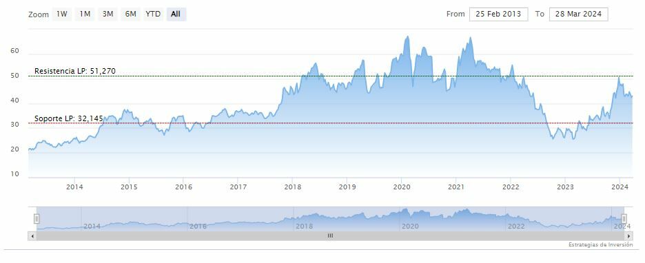 La resistencia a mediano plazo se encuentra en los 50.56 dólares. Mientras, los indicadores de Ei se muestran mixtos.