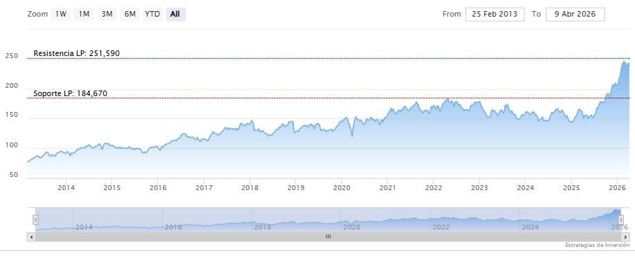 La resistencia a mediano y largo plazo se encuentra en los 251.59 dólares. Mientras, los indicadores de Ei se muestran mixtos.