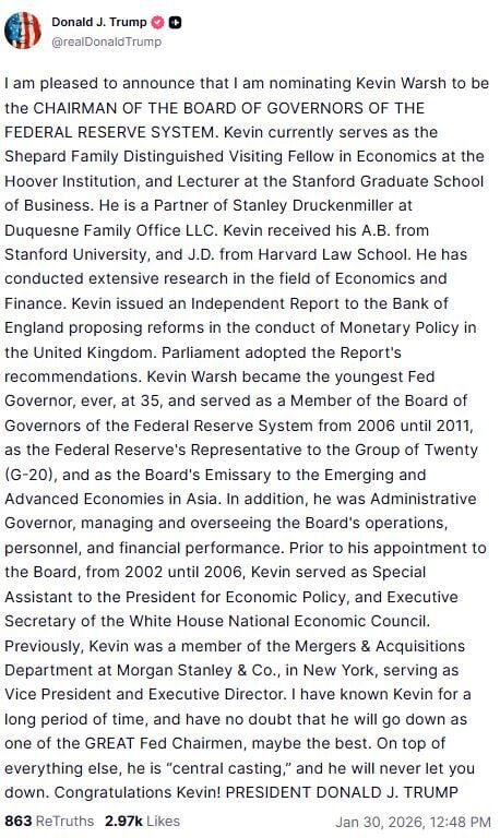 Donald Trump ha nominado a Kevin Warsh como futuro presidente de la Fed. El presidente de Estados Unidos ha señalado en su red social, Truth Social " conozco a Kevin desde hace mucho tiempo y no tengo ninguna duda de que pasará a la historia como uno de los GRANDES presidentes de la Reserva Federal, quizás el mejor. Además, es un personaje central y nunca te decepcionará. ¡Felicidades, Kevin!".