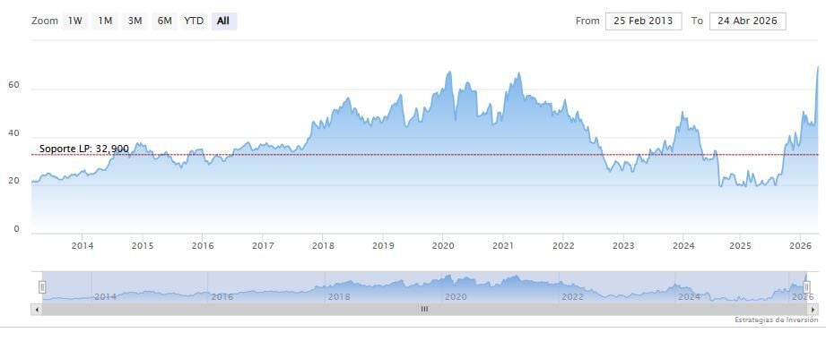 La resistencia a mediano y largo plazo se encuentra a tan solo 0.22 dólares del cierre. Mientras, los indicadores de Ei se muestran prácticamente alcistas.
