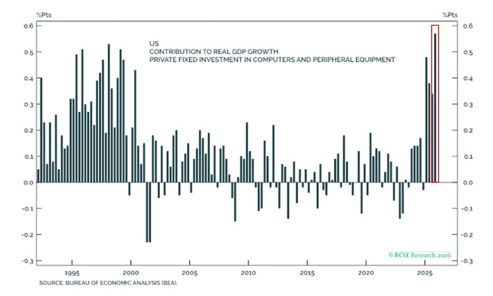 La contribución de los ordenadores y los equipos periféricos al PIB real del cuarto trimestre de 2025 se disparó hasta alcanzar +0,57 puntos porcentuales, la cifra más alta de la historia. Esto supone el cuarto trimestre consecutivo con una contribución superior a +0,30 puntos porcentuales al crecimiento económico.