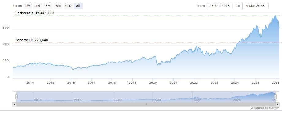 La resistencia a mediano y largo plazo se encuentra en los 387.36 dólares. Mientras, los indicadores de Ei se muestran en su mayoría bajistas.