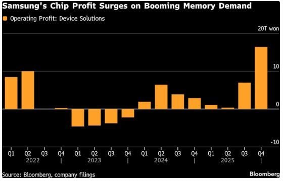 La unidad de chips de Samsung reportó una quintuplicación de sus ganancias, muy por encima del promedio de las estimaciones de los analistas. También dijo que recompraría 3.57 billones de wones de sus acciones y anunció un pago de dividendo especial que eleva su pago del cuarto trimestre a 3.75 billones de wones.