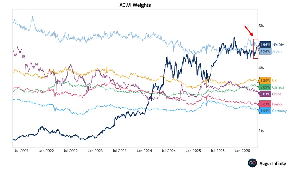 La ponderación de Nvidia es ahora mayor que la proporción de Japón, del 4,94%, el tercer mercado bursátil más grande del mundo, y supera a la de Francia y Alemania juntas.