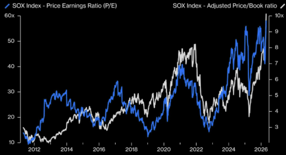 Y, precisamente, hablando de los semiconductores, las acciones del sector cotizan actualmente con un PER de 60, la valoración más elevada desde la burbuja de las puntocom.