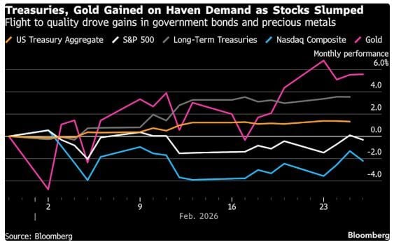 El resultado: la rentabilidad de los bonos estadounidenses a 10 años cayó 25 puntos básicos este mes (la mayor caída en un año), superando el 4% por primera vez desde noviembre. El índice Bloomberg de bonos del Tesoro registró una rentabilidad del 1.5% en febrero, mientras que un indicador de deuda a largo plazo avanzó un 4%.