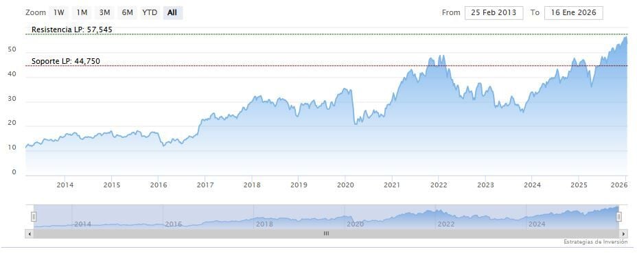La resistencia a medio y largo plazo se encuentra en los 57.54 dólares. Mientras, los indicadores de Ei se muestran mixtos.