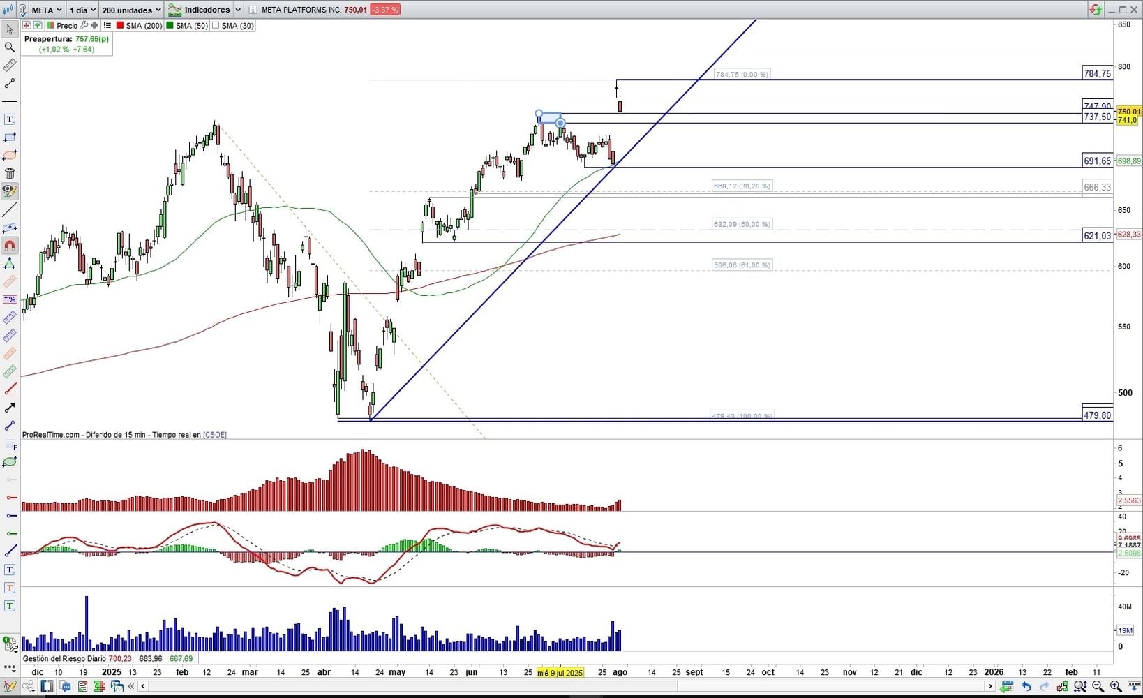 A más corto plazo, el gráfico muestra que las correcciones con las que venía el valor se ven fuertemente amortiguadas por los avances del jueves 31 de julio de más del 11%. "Estructura de máximos y mínimos crecientes que, lejos de verse mermada, se ve reforzada y permite actualizar la directriz creciente desde los mínimos de abril de 2025. El MACD tiene nuevos cortes ascendentes tras purgar lecturas de sobrecompra y repuntes del volumen de contratación. Con lo que mientras no haya cierres por debajo de los soportes de 747,9-737,5 dólares, seguiremos sin ver las primeras señales de un giro de mercado a corto plazo", dice José Antonio González, Director de análisis técnico de Estrategias de inversión. Te interesa: Aumentan las divergencias entre el selecto grupo de las 7 Magníficas.