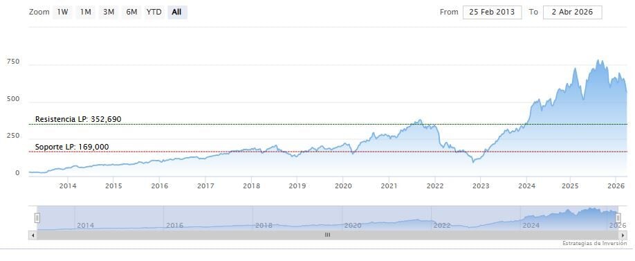 Meta (Facebook) cerraba el lunes al alza en los 574.62 dólares. La media móvil de 70 periodos se mantiene encima de las últimas velas, RSI a la baja en los 41 puntos y las líneas del MACD debajo del nivel de cero.