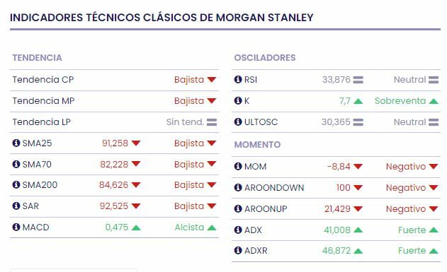 Morgan Stanley cerraba la sesión del lunes a la baja en los 22.61 dólares. La media móvil de 70 periodos se mantiene debajo de las últimas velas, RSI a la baja en los 49 puntos y las líneas del MACD encima del nivel de cero.