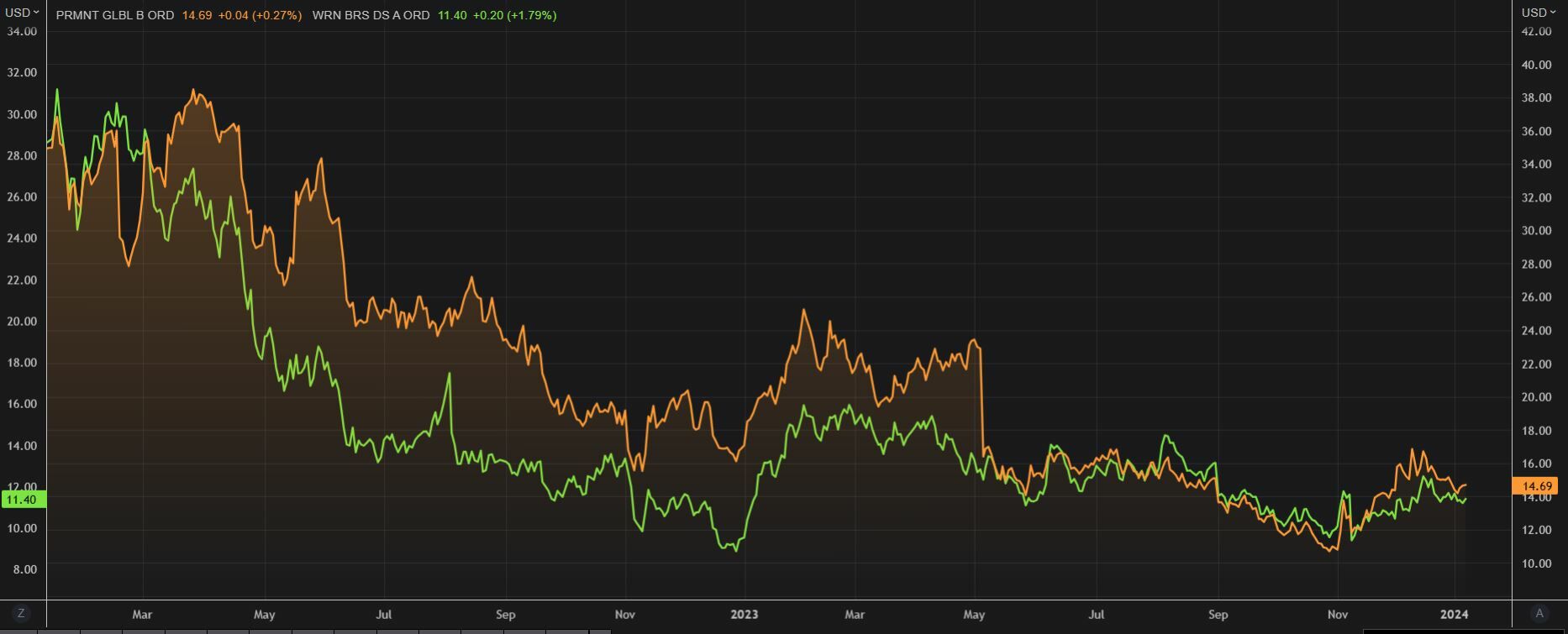 Evolución en bolsa de Paramount Global y Warner Bros. Fuente: Reuters.