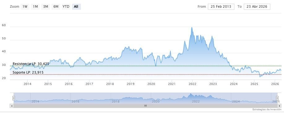 La resistencia a mediano plazo se encuentra en los 28.74 dólares. Mientras, los indicadores de Ei se muestran mixtos.