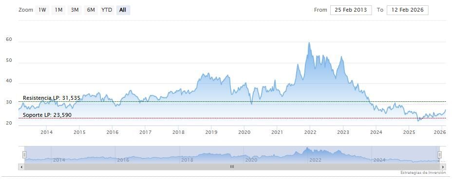 La resistencia a mediano plazo se encuentra en los 27.93 dólares. Mientras, los indicadores de Ei se muestran mixtos.