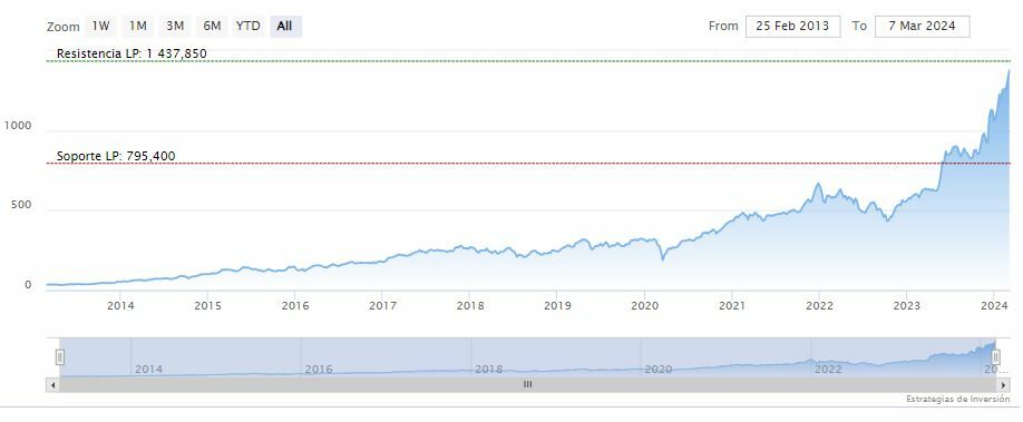 Broadcom cotiza al alza en la tarde del viernes en los 1.392 dólares. Las medias móviles de 70 y 200 periodos se mantienen debajo del precio, RSI a la baja en los 65 puntos y las líneas del MACD encima del nivel de cero.