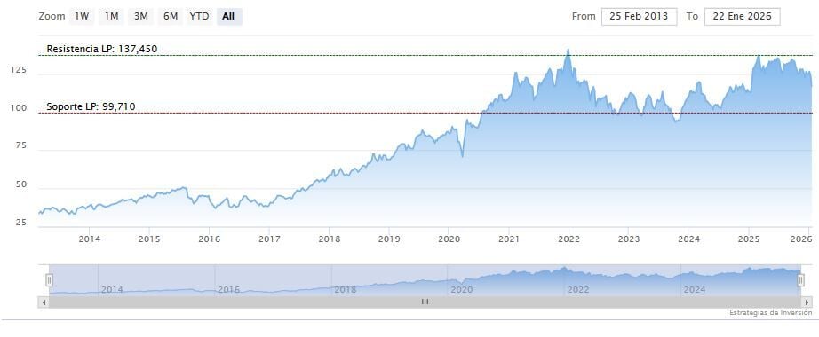 El soporte a mediano plazo se encuentra en los 105.92 dólares. Mientras, los indicadores de Ei se muestran prácticamente bajistas.
