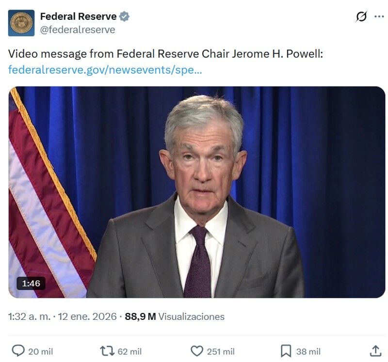 En ese momento, y en las páginas de la Fed, sin gafas a lo que no nos tiene acostumbrados, señalaba culpables. "Esta nueva amenaza no se refiere a mi testimonio del pasado junio ni a la renovación de los edificios de la Reserva Federal.... La amenaza de cargos penales es consecuencia de que la Reserva Federal fija las tasas de interés con base en nuestra mejor evaluación de lo que beneficiará al público, en lugar de seguir las preferencias del presidente".