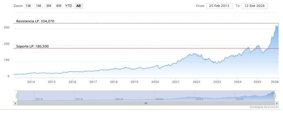 Alphabet-A cotiza al alza en la tarde del martes en los 339.39 dólares. Las medias móviles de 70 y 200 periodos se mantienen debajo del precio, RSI al alza en los 74 puntos y las líneas del MACD encima del nivel de cero.