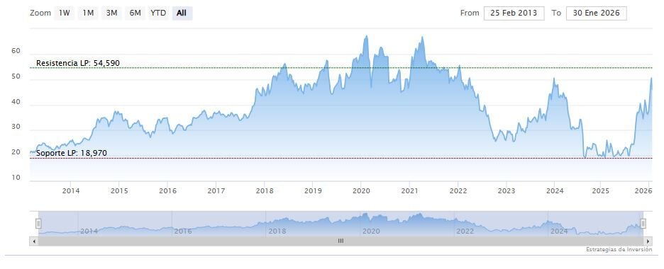 La resistencia a mediano y largo plazo se encuentra en los 54.59 dólares. Mientras, los indicadores de Ei se muestran mixtos.