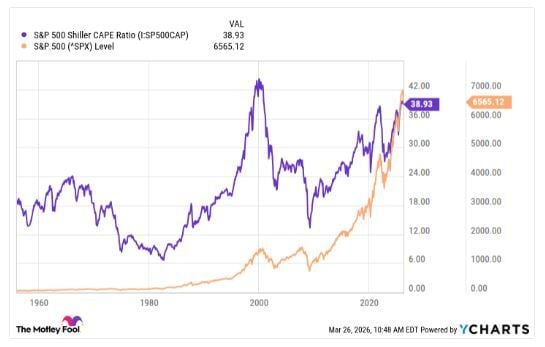 Por lo tanto, no sorprende que los inversores se pregunten si, dada la inestabilidad, el mercado podría estar a punto de desplomarse. Primero, analizaremos un indicador con más de 100 años de historia: el índice Shiller CAPE del S&P 500, una medida de los precios de las acciones ajustada a la inflación en relación con las ganancias por acción. Este índice ha alcanzado un nivel que solo se había visto una vez antes, lo que indica que las acciones están particularmente caras hoy.