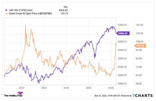 Mientras tanto, los precios del petróleo, que se han disparado recientemente, también se han asociado con caídas en la bolsa, como ilustra el gráfico a continuación.