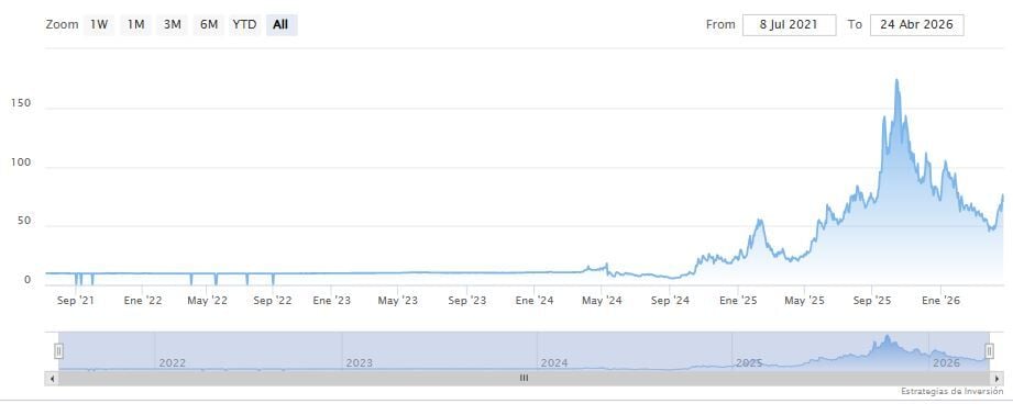 Oklo Rg-Acerraba el viernes a la baja en los 70.99 dólares. Las medias móviles de 70 y 200 periodos rodean a las últimas tres velas, RSI plano en los 61 puntos y las líneas del MACD encima del nivel de cero.