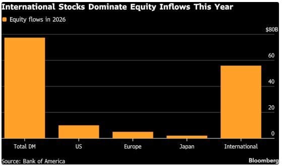 Esta posición extendida coincide con la retirada de 15.400 millones de dólares de los inversores de los fondos de renta variable durante la semana, según los estrategas de Bank of America, lo que subraya una mayor cautela a medida que los mercados bursátiles suben. El índice MSCI World alcanzó un máximo histórico el 27 de enero y se encamina a su mes más sólido desde septiembre.