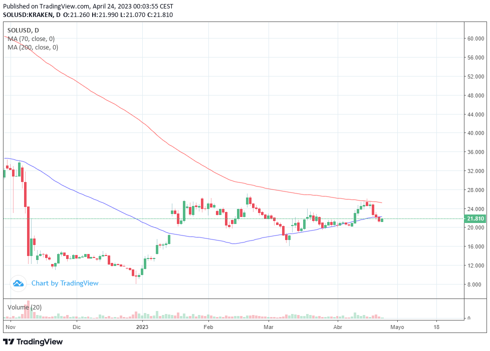 Solana cotiza en la apertura del lunes en los 21.34 dólares y la media móvil de 70 periodos se encuentra por encima de las dos últimas velas.