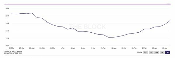 El reciente lanzamiento del rastreador de emisiones en la red Solana ha tenido un efecto dominó en otras métricas en cadena. Por ejemplo, la cantidad de direcciones activas diarias en la red aumentó a 266.940 el 22 de abril, un crecimiento notable de alrededor del 12 % en solo una semana.