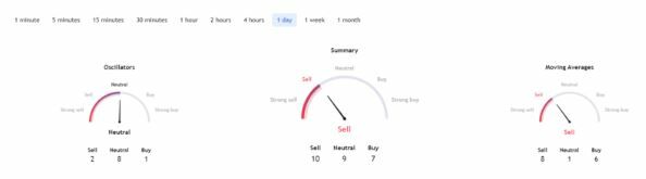 Según los indicadores de un día de TradingView, el análisis técnico de Solana actualmente muestra un sentimiento predominantemente bajista. El resumen de los indicadores sugiere un sentimiento de "venta" en 10, similar a los promedios móviles, que indican una "venta" en 8. Además, los osciladores indican un sentimiento "neutral" en 8.