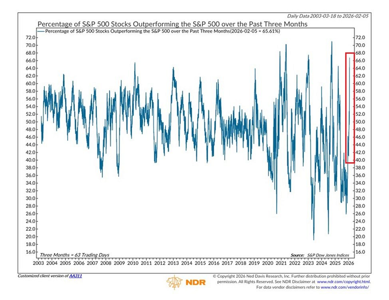 ¿Y qué podemos decir de la bolsa? ¿Está fundado el miedo que impera en el mercado? El 65,6% de las acciones del S&P 500 han superado al índice de referencia en los últimos tres meses, la cifra más alta desde hace más de un año. En comparación, la media a largo plazo es de alrededor del 50%, mientras que el mínimo en 20 años fue del 19%.