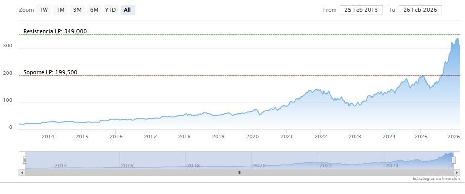 La resistencia a mediano y largo plazo se encuentra en los 349 dólares. Mientras, los indicadores de Ei se muestran mixtos.