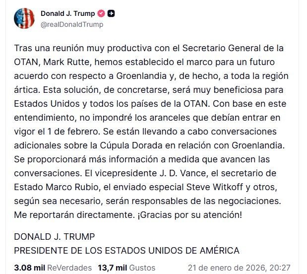 Trump ha señalado en su red social que los dos líderes alcanzaron "el marco de un futuro acuerdo con respecto a Groenlandia" durante lo que describió como discusiones productivas, y declaró que el posible acuerdo beneficiaría a Estados Unidos y a todos los miembros de la OTAN. "Basándome en este entendimiento, no impondré los aranceles que estaban previstos para entrar en vigor el 1 de febrero", escribió Trump en Truth Social.