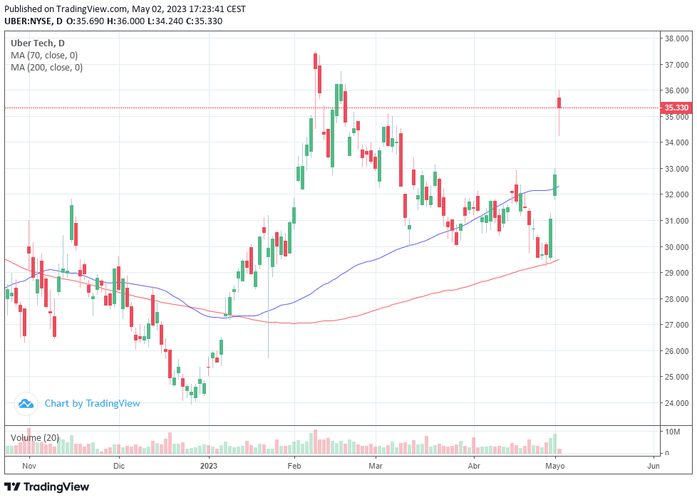 Uber Tech cotiza en los 35.29 dólares en rojo, pero con un segundo gap alcista consecutivo, y las medias móviles de 70 y 200 periodos se encuentran por debajo del mencionado gap.