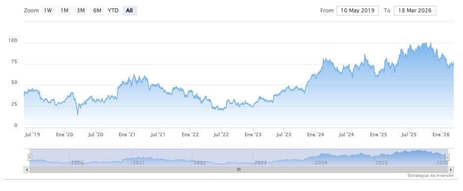 Uber Techcotiza a la baja en la tarde del jueves en los 75.98 dólares. La media móvil de 70 periodos se encuentra encima de las últimas tres velas, RSI a la baja en los 51 puntos y la línea rápida (azul) del MACD a punto de cruzar por encima del nivel de cero.