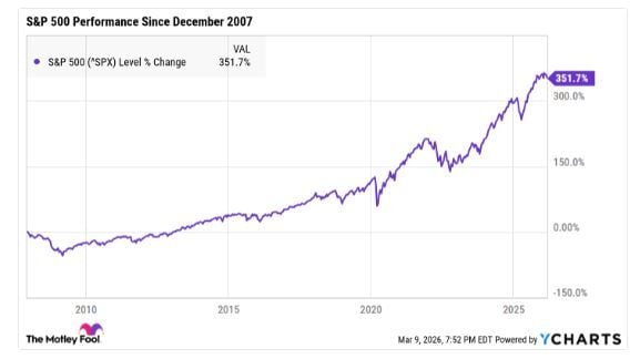 Aunque a menudo es más fácil decirlo que hacerlo, seguir invirtiendo de forma constantees clave para obtener ganancias a largo plazo. Si algo nos enseña la historia, es que el mercado está prácticamente garantizado para prosperar con el tiempo. De hecho, desde diciembre de 2007, el inicio oficial de la Gran Recesión, el S&P 500ha subido más de un350%.