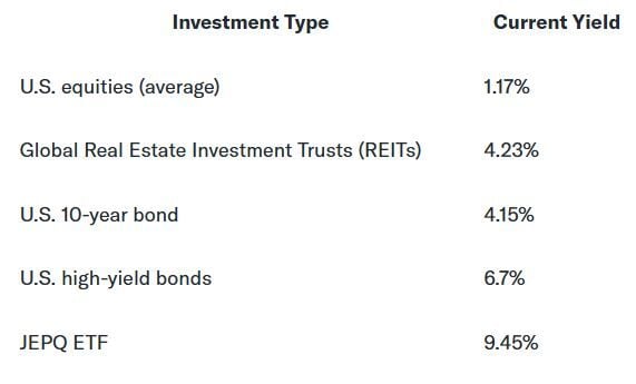Actualmente, el ETF JEPQ tiene una rentabilidad por dividendo del 10,1 %. Esta rentabilidad no será constante mes a mes, pero puede estar seguro de que será superior a la de otras clases de activos. Aquí tiene una comparación utilizando la rentabilidad de la SEC a 30 días, una tasa de rendimiento estandarizada calculada durante los últimos 30 días.